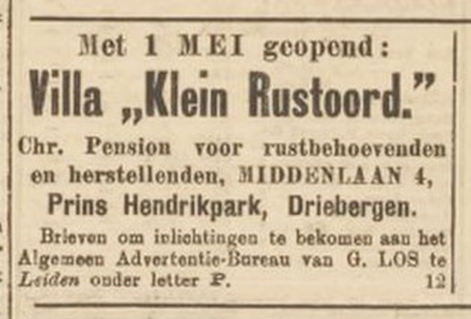 Villa Wilhelmina Chr. Pension ‘Klein Rustoord, aan de Middenlaan 4. In: De Nederlander, Nederlandsch Dagblad tot verbreiding van Christelijk-Nationale beginselen, 24 maart 1907, pag. 4, Delpher