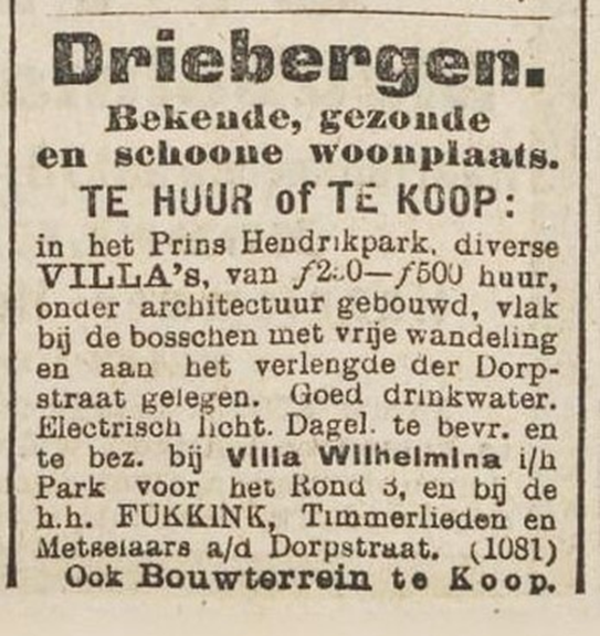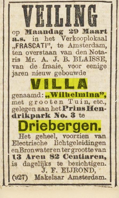Veiling van de Driebergse villa Wilhelmina. Het Nieuws van den dag, 29 maart 1909. Delpher