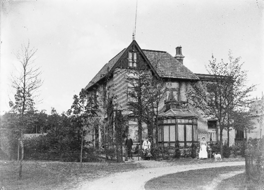 Villa Wilhelmina (naambordjes op het toegangshek) met daarin gevestigd Chr. pension ‘Klein Rustoord’ van mej. Rijksen. Ook wel: pension Rijksen, 1906-1911. Prentbriefkaart J. Hoekstra. 17651/Beeldmateriaal/Het Utrechts Archief (HUA)
