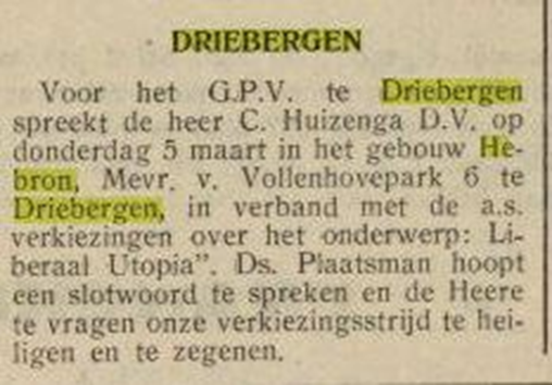 Vanaf ongeveer 1929 werd de villa aan het Mevrouw van Vollenhovenpark 6 in Driebergen bestemd als NCGB-post ‘Hebron Driebergen’, toentertijd nog voorzien van een grote tuin. De villa bood voldoende woonruimte alsmede ruimte voor allerlei bijeenkomsten, conferenties, e.d.